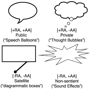 I’m pleased to announce that my paper, “Beyond Speech Balloons and Thought Bubbles,” (PDF) has now been published in the journal Semiotica. The paper dissects the ways in which text and image connect to each other. I argue that speech balloons and thought bubbles are actually two “surface” representations of a deeper structure where the meaning can be varied by just a few primitive variables. The overall discussion then reveals a lot about the elements involved in text/image relations, their connection to panels and other aspects of the visual language of comics.