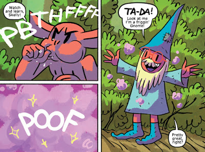 So, not all elements can replace actions in panels. Recently, I stumbled on another one though in the comic Rickety Stitch and the Gelatinous Goo where an imp uses magic to transform into looking like a gnome:
