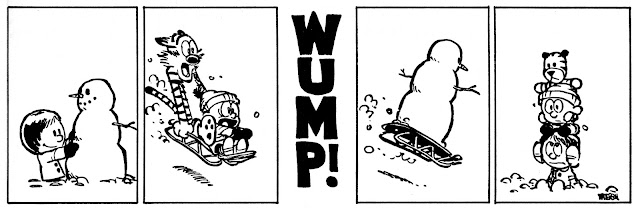 In many cases, the onomatopoeia is not needed for these replacement panels, and I’ve found examples both with and without text. Similar replacement seems to occur without the visual language of the images (clouds, stars), and with the onomatopoeia alone, as in this Calvin and Hobbes strip: