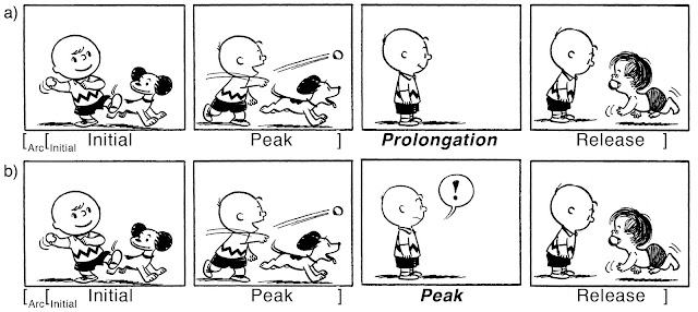 The top sequence (a) is from an actual Peanuts strip. What is key here is that you never see the main event of the sequence: Linus retrieving the ball. In my narrative structure, this “climactic” state would be called a “Peak.” Rather, the image of Charlie watching ambiguously hides this event, but that panel is more characteristic of a “Prolongation” that extends the narrative further without much action.