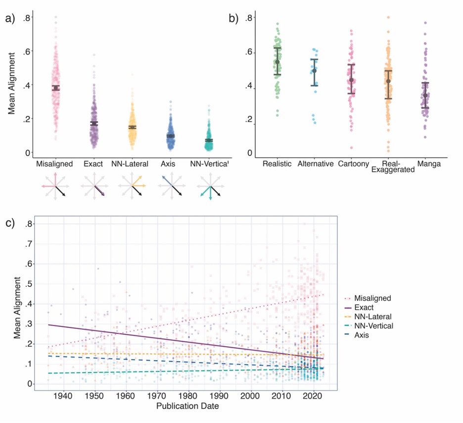 We also see that the rates of flow alignment overall have been decreasing over time in comics from the 1930s to the 2020s. That is, in general comic pages have been using less flow alignment, and more misalignment between the panel directions and layout directions.