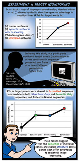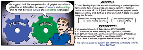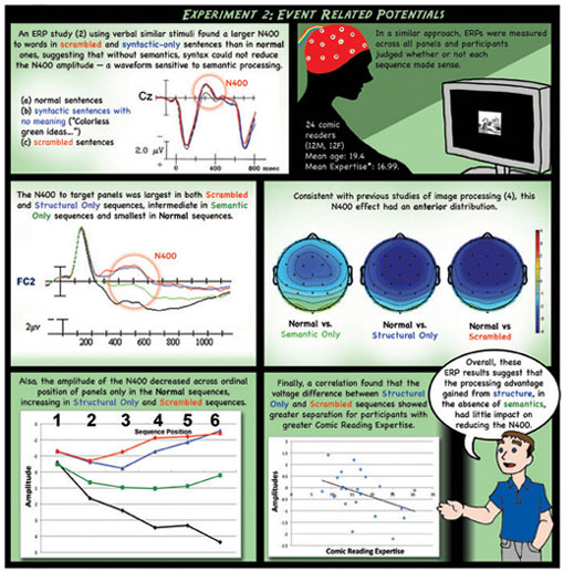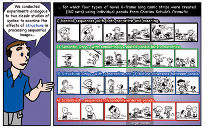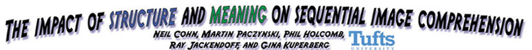 This study explored the relationship between narrative and meaning in sequential image understanding. Sorry the text is so small... it was originally a very large poster! It is a shortened version of the paper "(Pea)nuts and bolts of visual narrative" (pdf). A pdf version of this poster is available here.